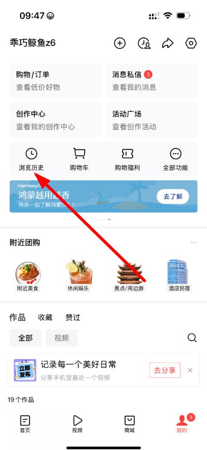 2、在我的頁(yè)面里,點(diǎn)擊瀏覽歷史選項(xiàng)。