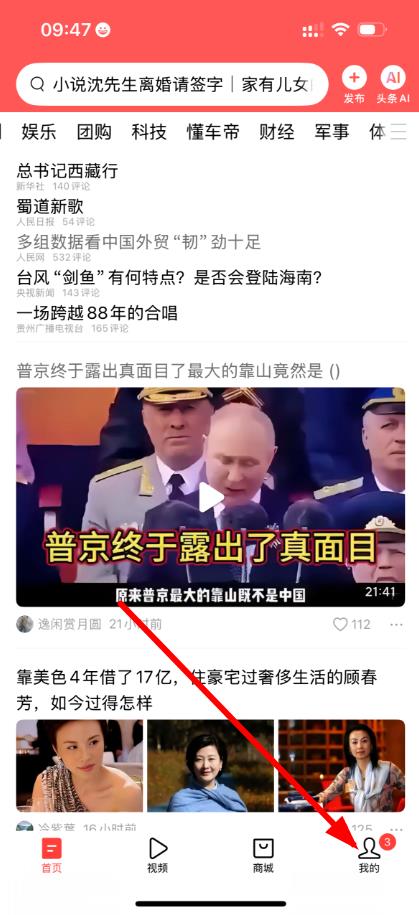 1、點(diǎn)擊今日頭條底部導(dǎo)航欄中的我的。