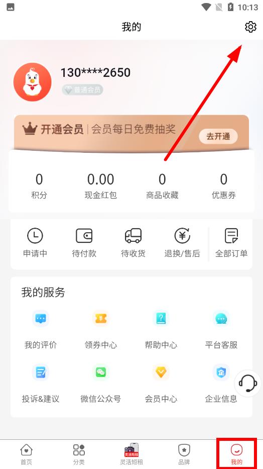 1、打開愛(ài)租機(jī)app點(diǎn)擊底部導(dǎo)航欄中的我的圖標(biāo),在該頁(yè)面右上角找到設(shè)置齒并點(diǎn)擊。
