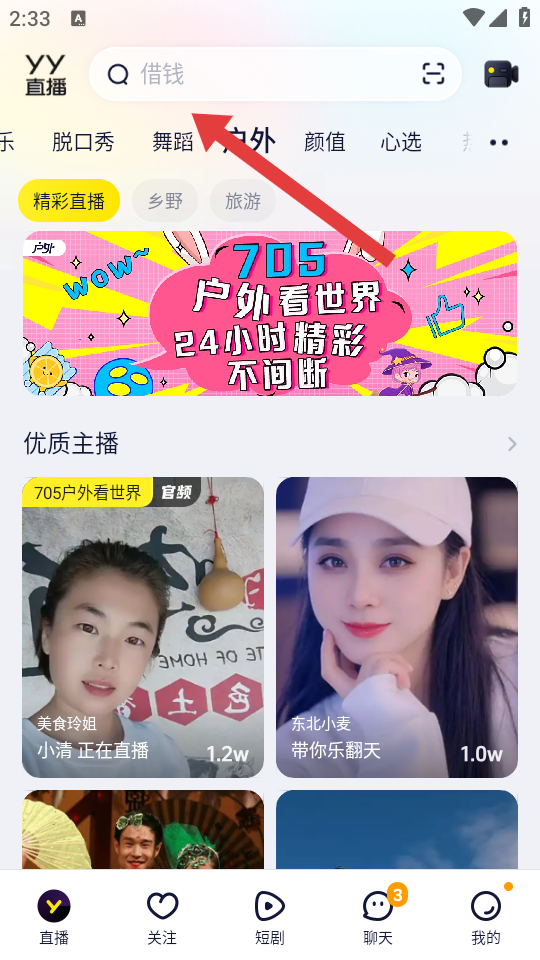 1、進入YY直播首頁后,我們點擊頂部的搜索框,輸入要添加好友的用戶名。