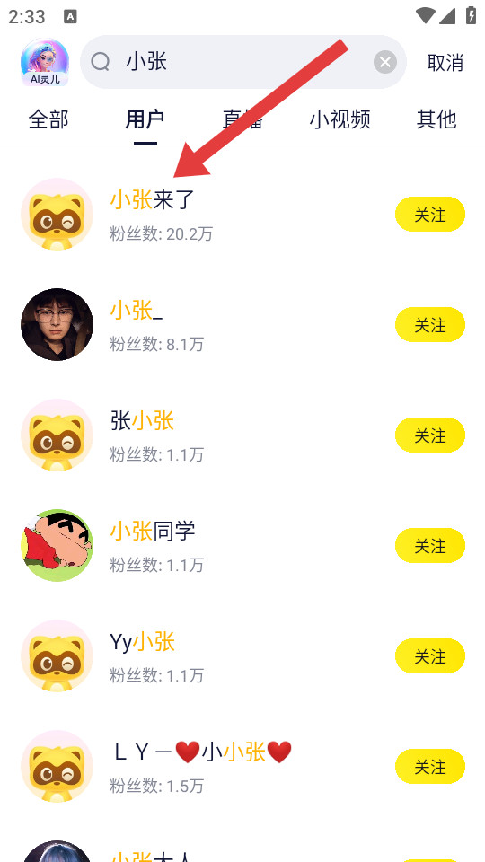 2、在搜索結果列表中,點擊目標用戶如小張來了,進入其個人詳情的頁面。