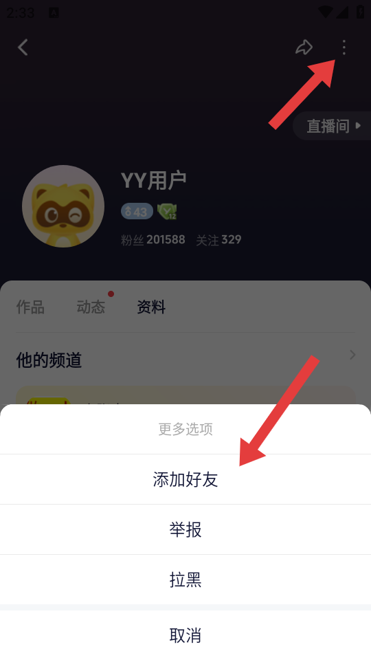 3、在用戶詳情頁面右上角,點擊三點圖標,在彈出的菜單中選擇添加好友,發(fā)送好友申請等待對方通過。