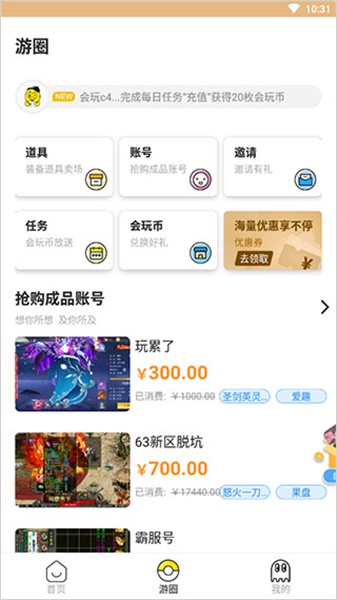 3、在游圈板塊,有豐富的道具、賬號(hào)、任務(wù)等等,支持玩家再次去搶購(gòu)一些高級(jí)的賬號(hào),做任務(wù)領(lǐng)取金幣等;