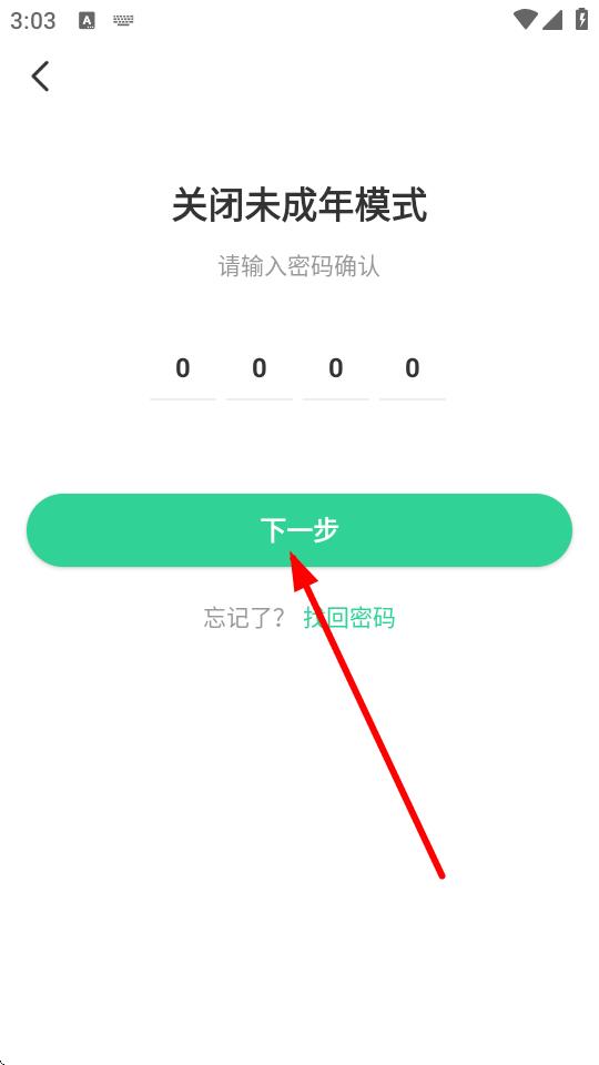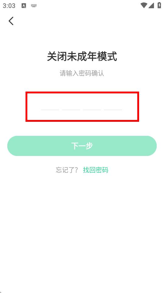 3、在關(guān)閉未成年模式頁(yè)面的密碼輸入框,輸入設(shè)置的密碼。