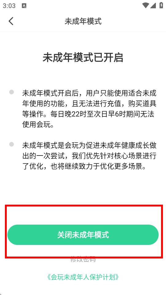 2、在彈出的未成年模式已開(kāi)啟界面中,點(diǎn)擊關(guān)閉未成年模式按鈕。