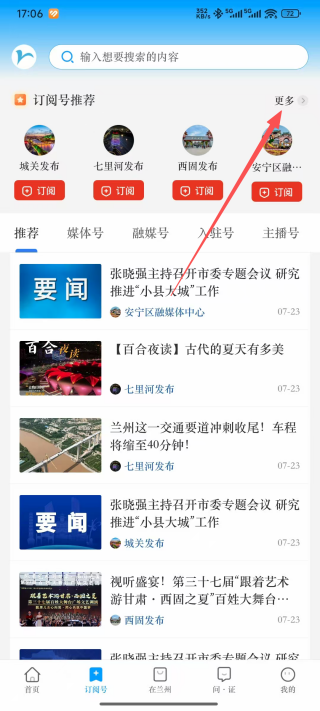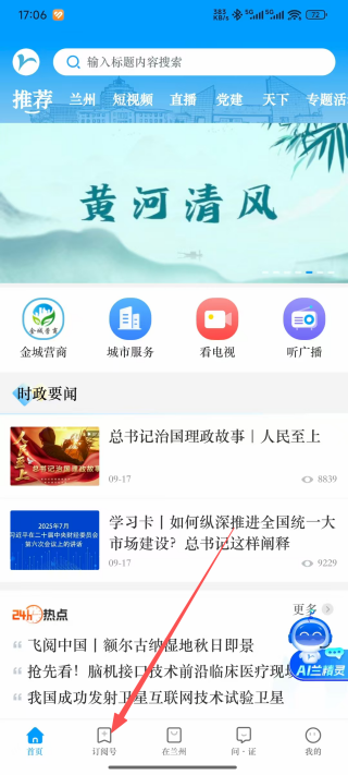 1、打開(kāi)愛(ài)蘭州APP,點(diǎn)擊底部導(dǎo)航欄中的訂閱號(hào)。