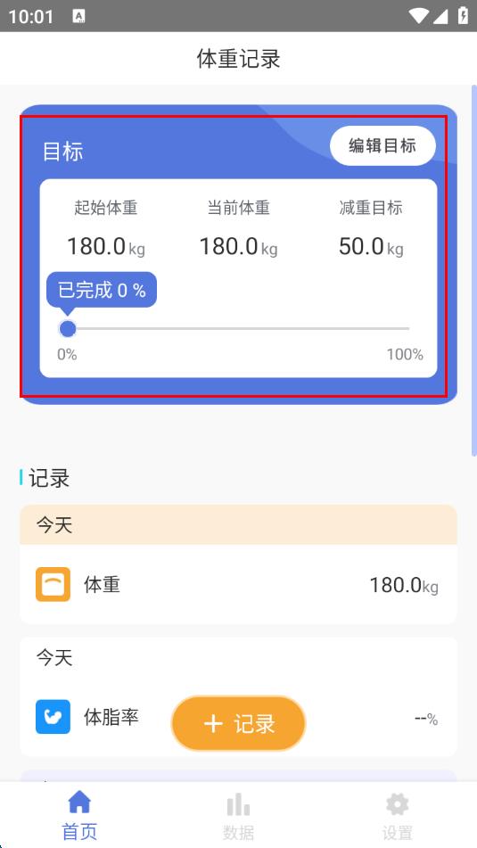 4、成功添加目標(biāo)體重,之后在首頁(yè)能查看目標(biāo)體重相關(guān)的進(jìn)度情況。