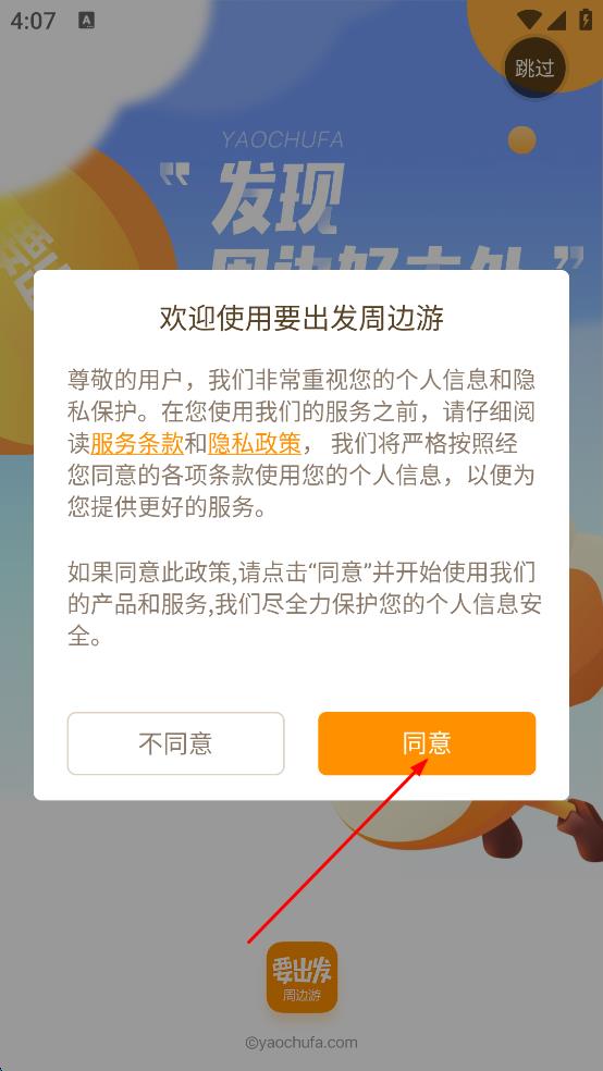 1、打開要出發(fā)周邊游App,彈出服務(wù)條款和隱私政策提示彈窗,點(diǎn)擊“同意”按鈕,進(jìn)入App主界面。