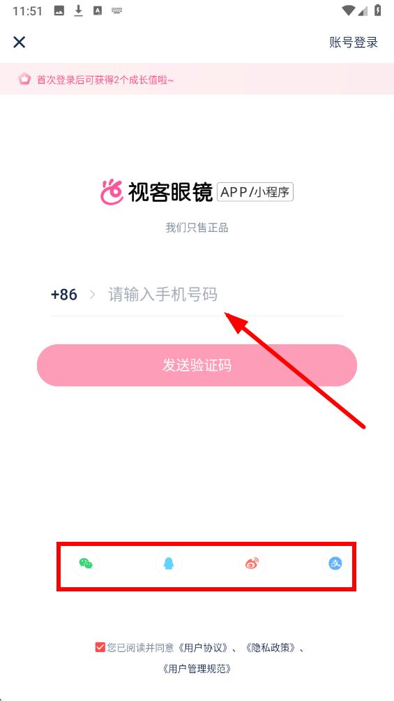 3、在賬號登錄注冊界面,可以選擇在請輸入手機號碼框中輸入手機號通過驗證碼完成注冊,也可以點擊下方的第三方登錄圖標快速注冊。