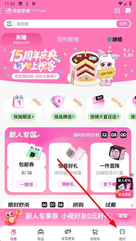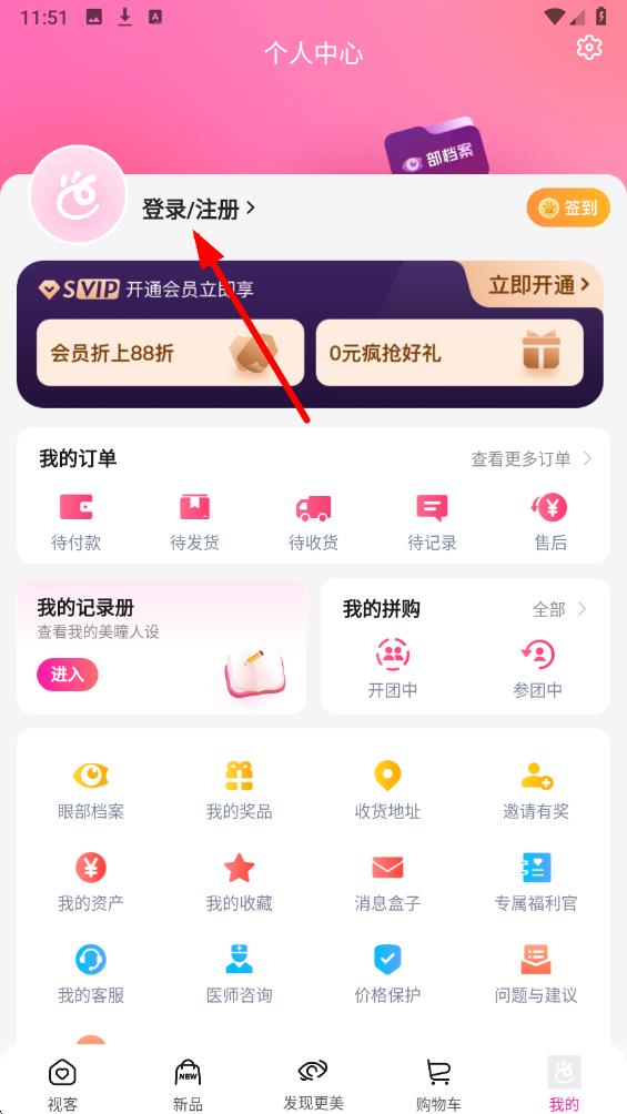 1、打開視客眼鏡網(wǎng)app,進入首頁后,點擊底部導航欄最右側(cè)的我的選項,進入個人中心頁面。