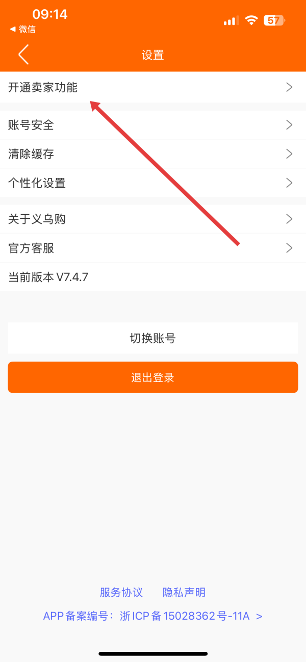 2、在設置界面中,點擊開通賣家功能選項,即可進入商家賬號開通流程。