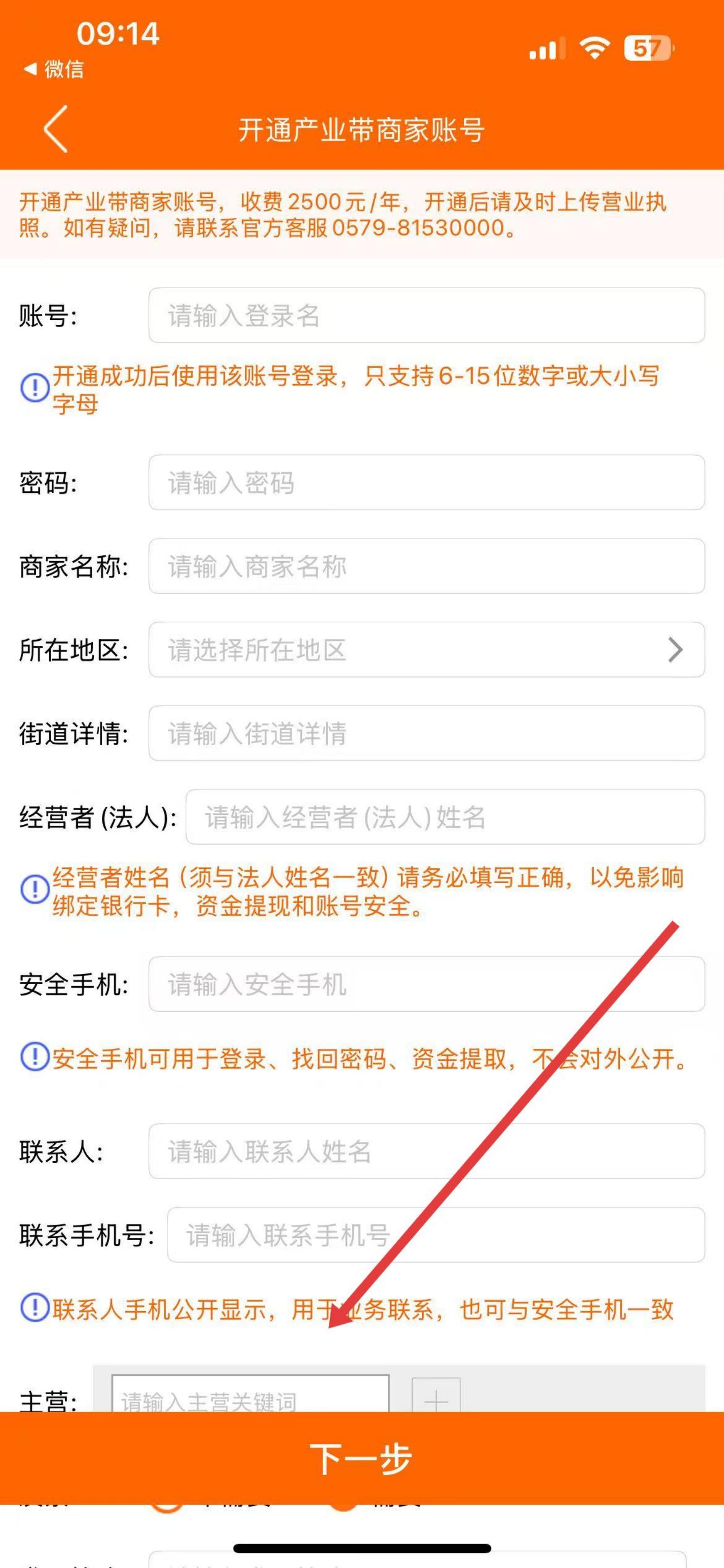 3、在開通產(chǎn)業(yè)帶商家賬號頁面,按要求依次填寫信息,注意各項填寫規(guī)范提示,填寫完畢后點擊底部下一步按鈕,按后續(xù)指引完成注冊。