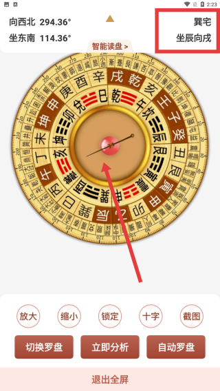 1、在智能羅盤(pán)界面中,按照箭頭指示點(diǎn)擊全屏,進(jìn)入全屏模式。