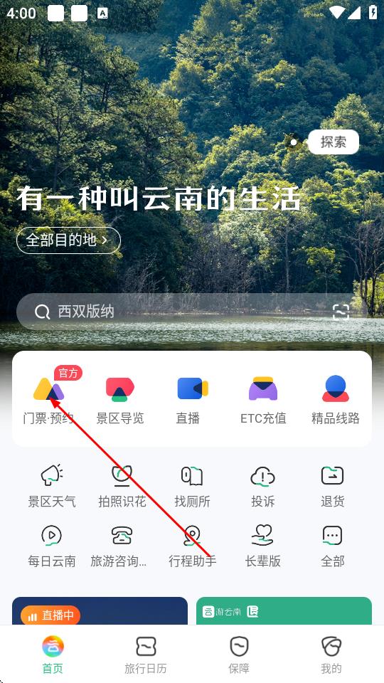 1、打開游云南APP,在首頁點(diǎn)擊門票·預(yù)約選項(xiàng)。