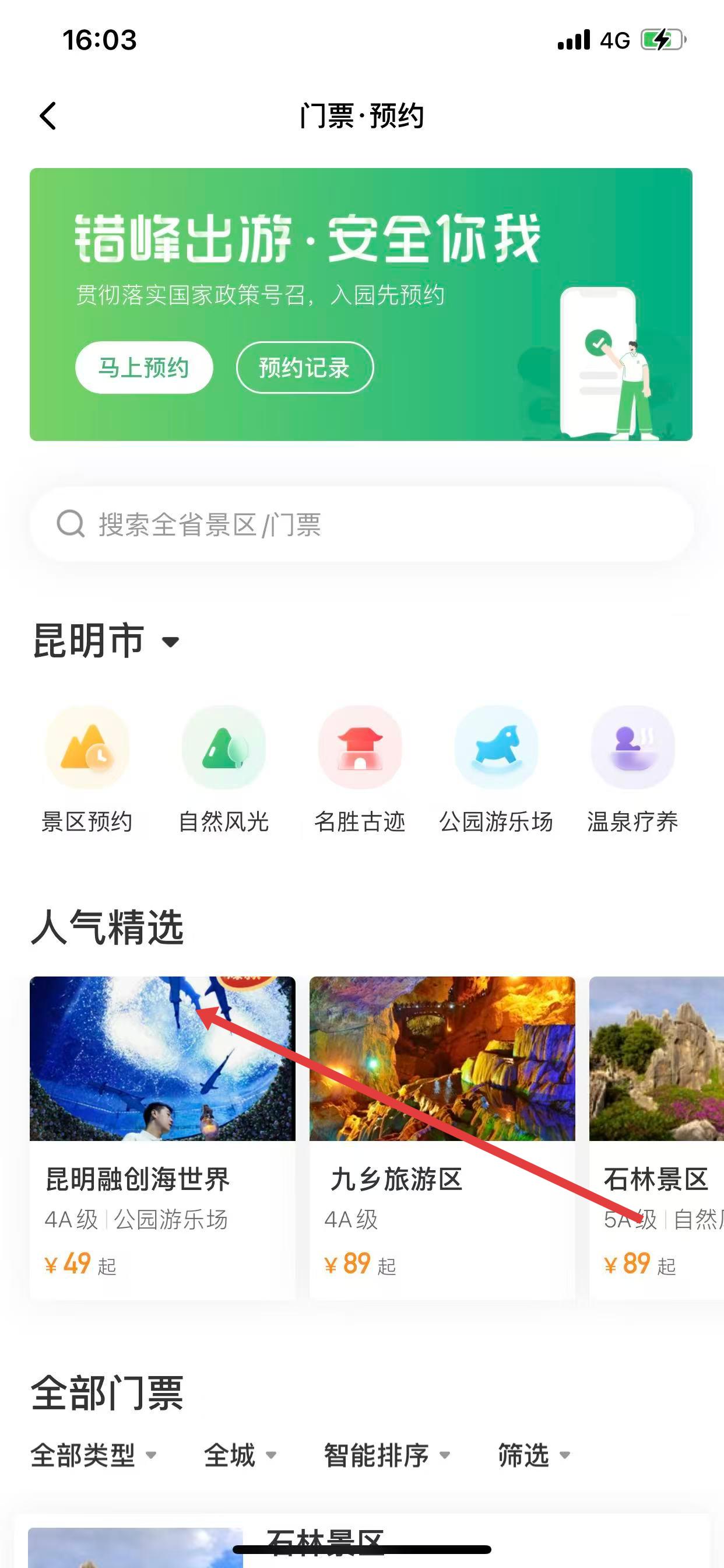 2、進(jìn)入門票·預(yù)約頁面后,選擇心儀的景區(qū),如昆明融創(chuàng)海世界。