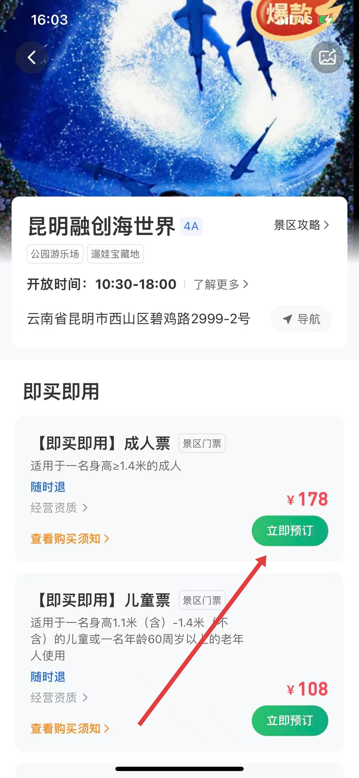 3、進(jìn)入景區(qū)詳情頁面,選擇需要購(gòu)買的門票類型,點(diǎn)擊立即預(yù)訂。