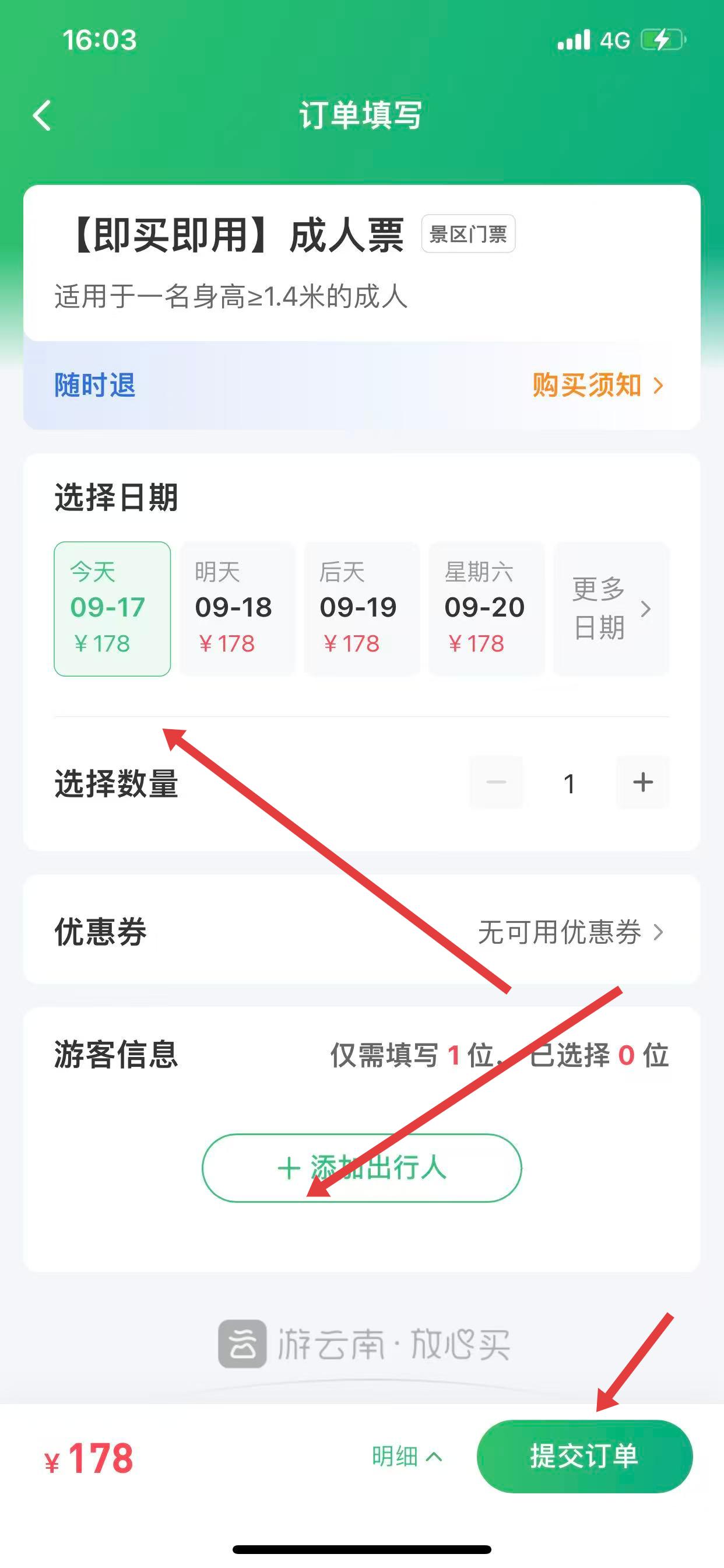 4、在訂單填寫頁面,選擇出行日期和門票數(shù)量,添加出行人信息,點(diǎn)擊提交訂單,即可完成門票預(yù)約。
