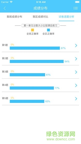 分析:查看布置給學(xué)生的作業(yè)完成情況、成績(jī)分布情況、與其它班級(jí)學(xué)校的對(duì)比情況、及每道試題的正確率分析對(duì)比。