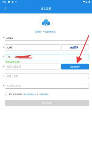 2、在業(yè)主注冊的界面內(nèi),輸入用戶昵稱、圖形碼以及手機號,再點擊獲取驗證碼的按鈕。