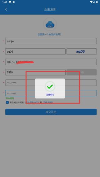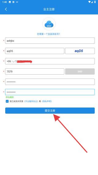 3、將收到的驗證碼輸入其中,再設(shè)置密碼后,再點擊提交注冊的按鈕。