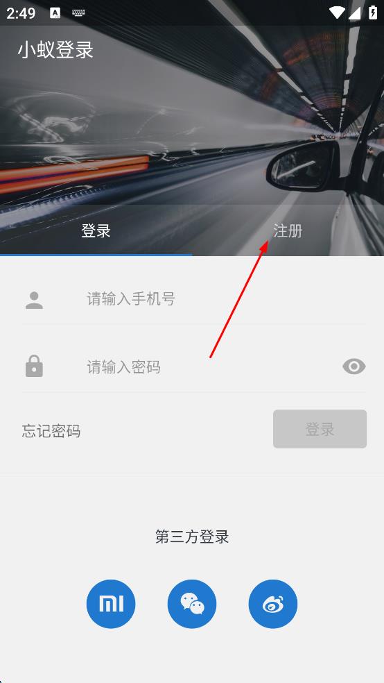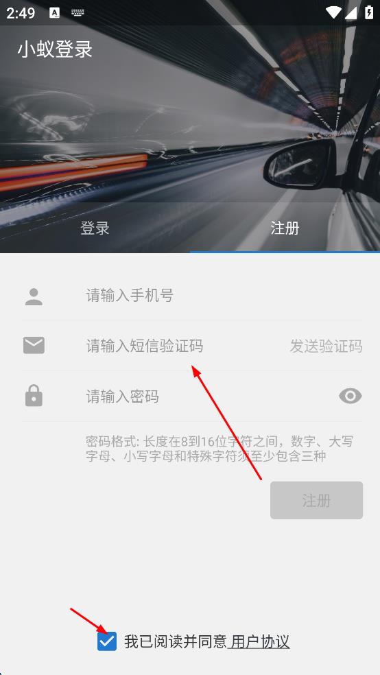 1、進(jìn)入小蟻登錄界面,點(diǎn)擊注冊(cè)選項(xiàng),跳轉(zhuǎn)至注冊(cè)頁面,此時(shí)需勾選我已閱讀并同意用戶協(xié)議,準(zhǔn)備輸入注冊(cè)信息。