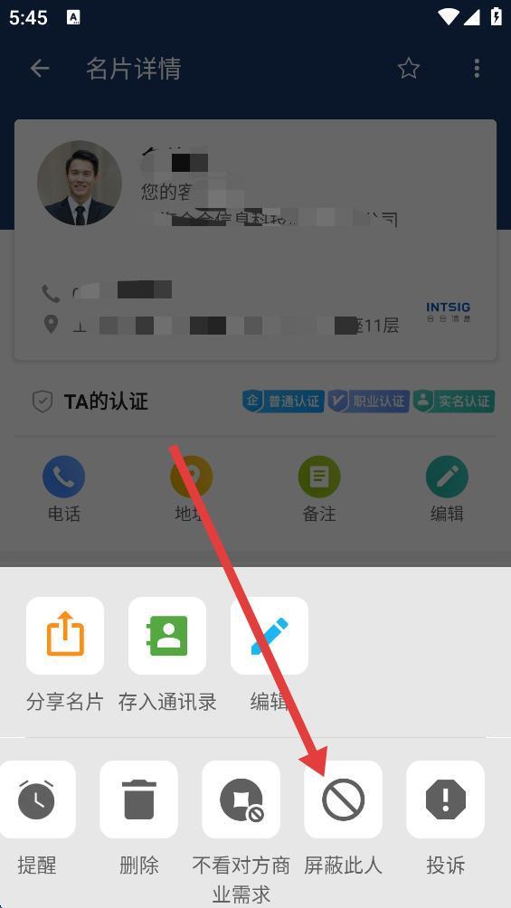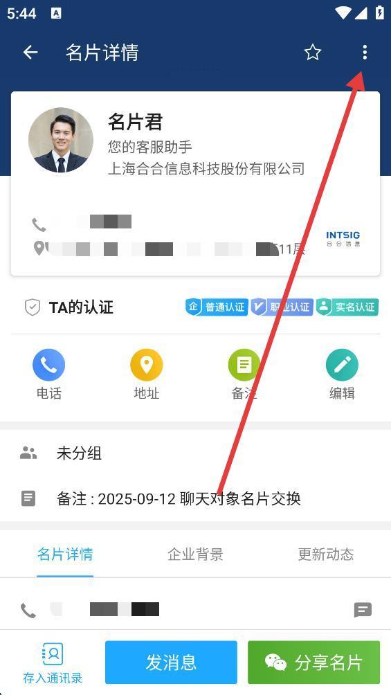 3、在名片詳情頁面中,點擊右上角的三點圖標(biāo),會彈出一個操作菜單。