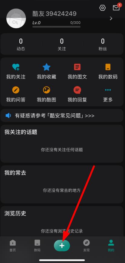 1、打開(kāi)酷安App,點(diǎn)擊底部導(dǎo)航欄中間的+號(hào)按鈕。