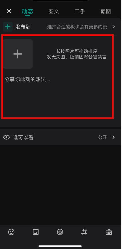 2、在發(fā)布頁(yè)面,輸入你想要分享的內(nèi)容,可添加圖片等素材。