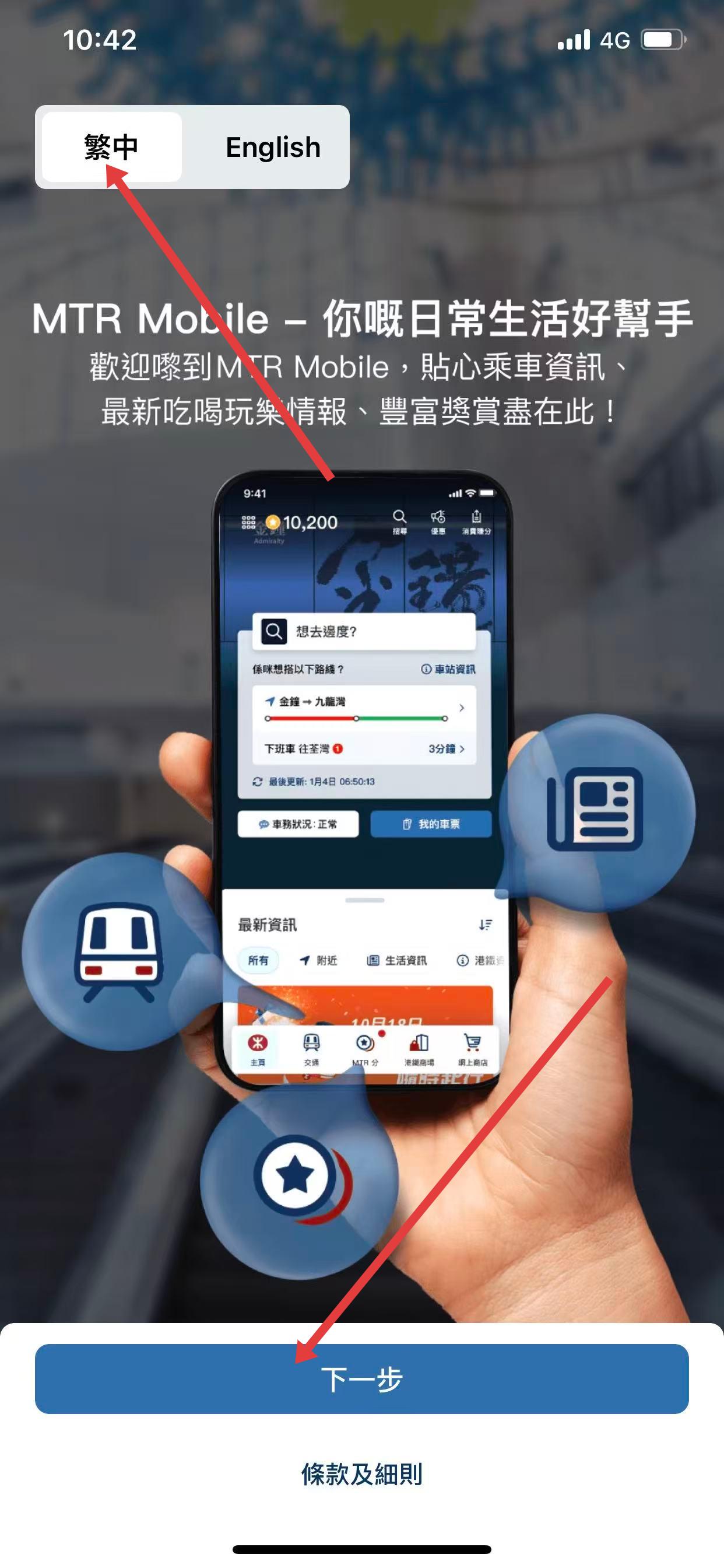 1、打開MTR Mobile應用,在初始界面選擇繁中,點擊下一步。