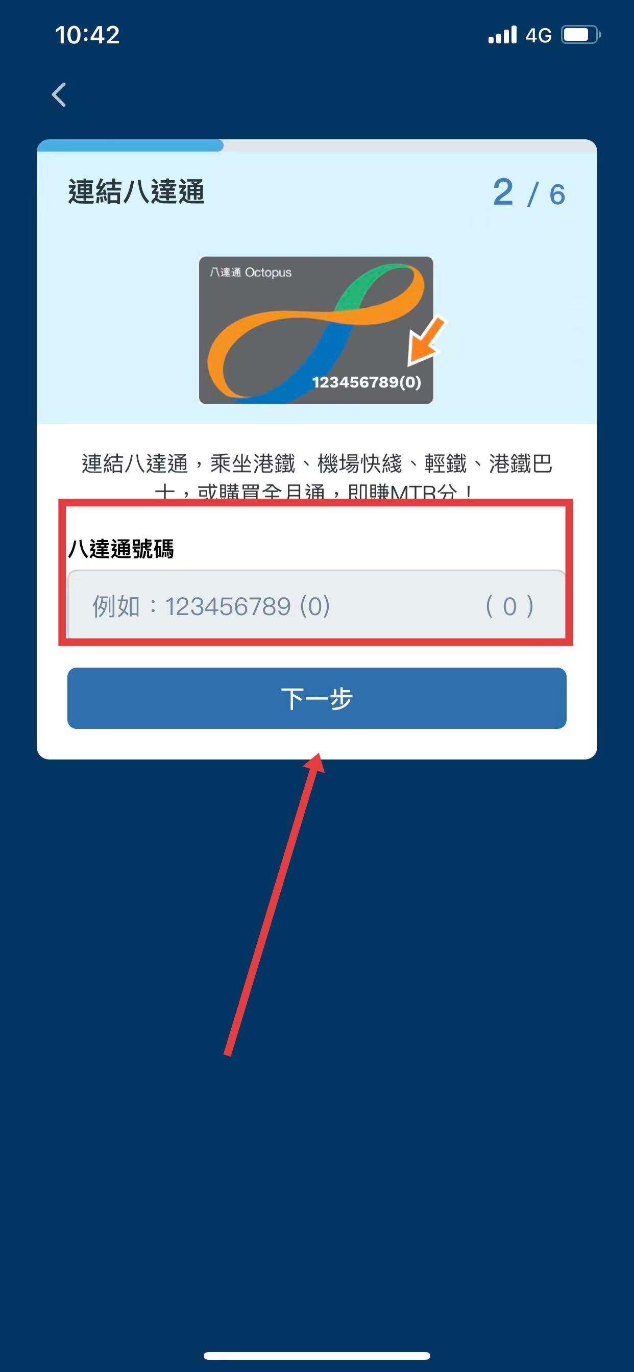 4、進入連結(jié)八達通頁面,如已有八達通,輸入八達通號碼,點擊下一步,若無也可直接點擊下一步跳過此步驟。