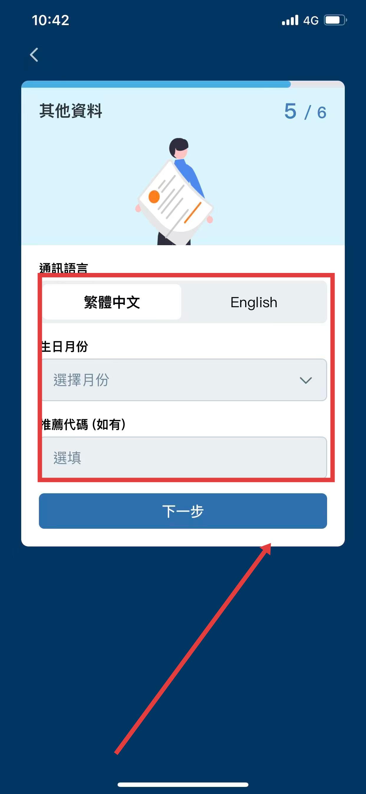 7、在“其他資料”頁面,選擇通訊語言,選擇生日月份,如有推薦代碼可填寫推薦代碼,點擊下一步。