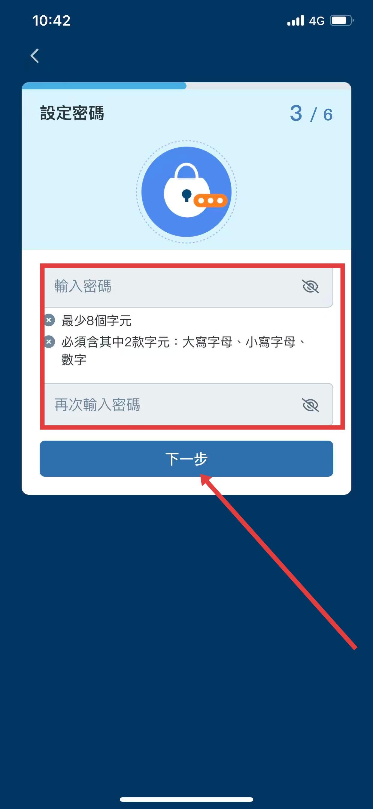 5、在設(shè)定密碼頁面,按照要求輸入密碼,再次輸入密碼進行確認,點擊下一步。