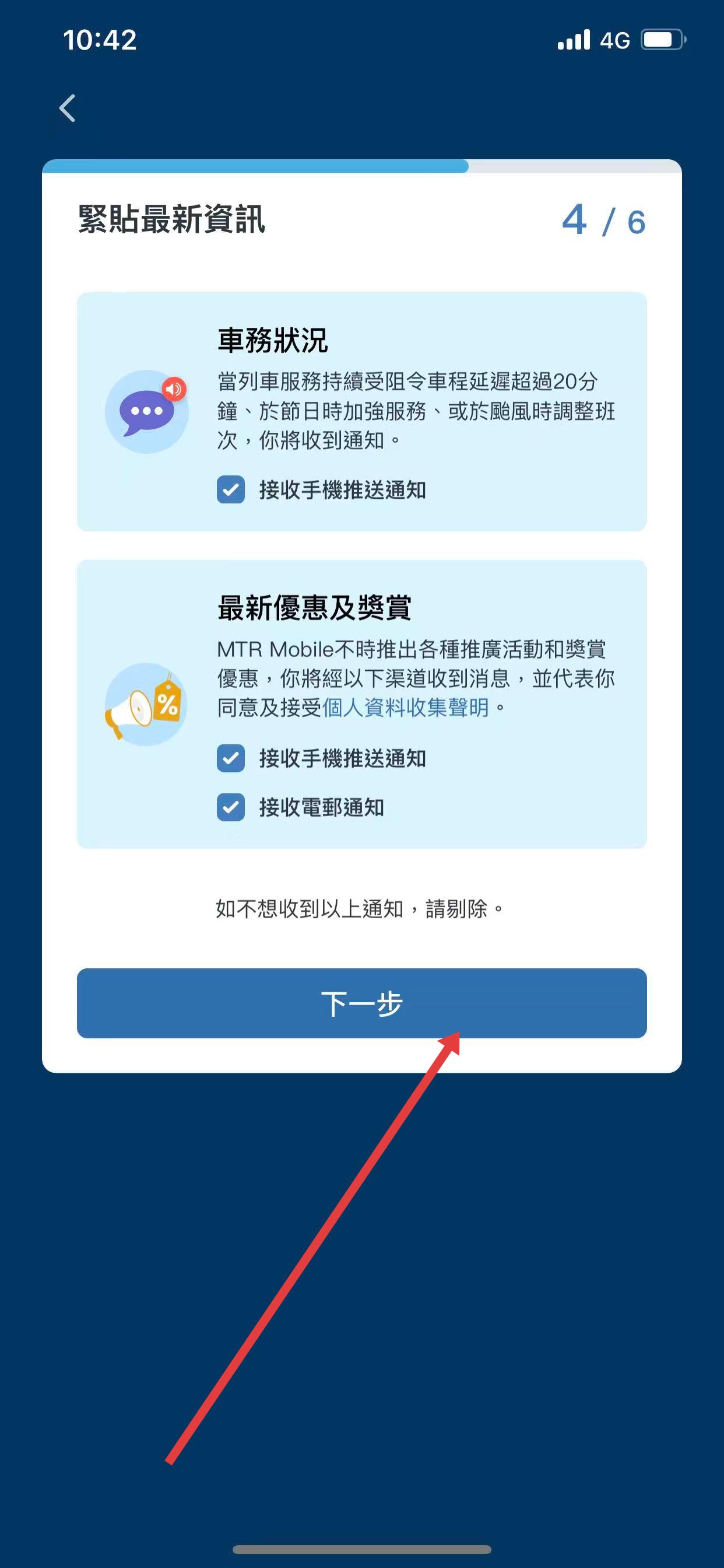 6、在緊貼最新資訊頁面,選擇是否接收車務狀況、最新優(yōu)惠及獎賞的通知,點擊下一步。