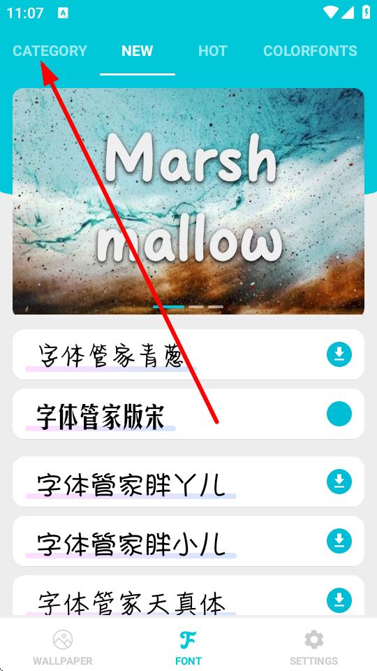1、在字體應(yīng)用界面,點(diǎn)擊頂部CATEGORY選項(xiàng),進(jìn)入字體分類(lèi)頁(yè)面。