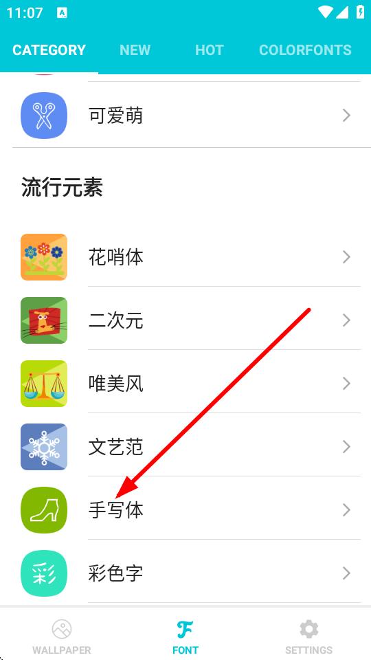 2、在字體分類(lèi)頁(yè)面,瀏覽并選擇喜歡的字體類(lèi)別,比如點(diǎn)擊手寫(xiě)體。