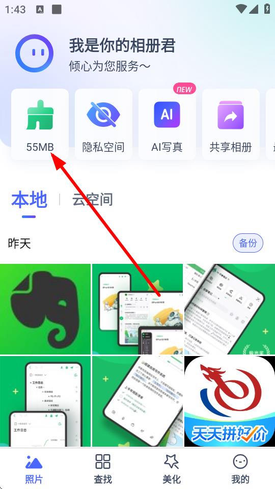 2、在照片頁面中,點(diǎn)擊55MB緩存顯示區(qū)域。