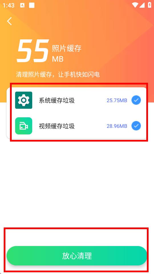 3、進(jìn)入照片緩存清理界面后,選擇需要清理的緩存類型,點(diǎn)擊放心清理按鈕。