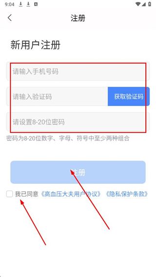 4、輸入手機號碼,填入驗證碼,設置密碼,勾選協(xié)議后,點擊注冊。