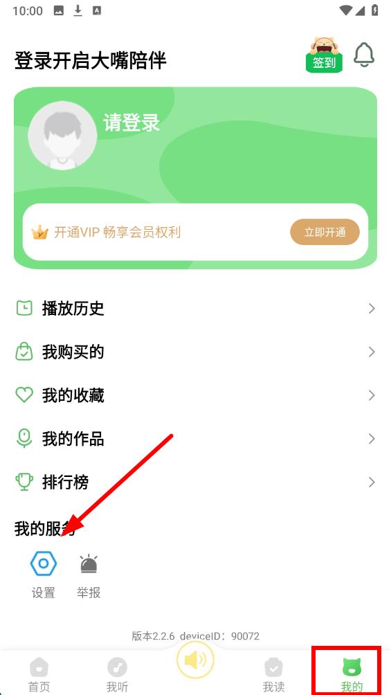 1、打開大嘴陪伴應(yīng)用,點(diǎn)擊底部我的圖標(biāo)在頁面中找到我的服務(wù)板塊,點(diǎn)擊設(shè)置選項(xiàng)進(jìn)入設(shè)置界面。