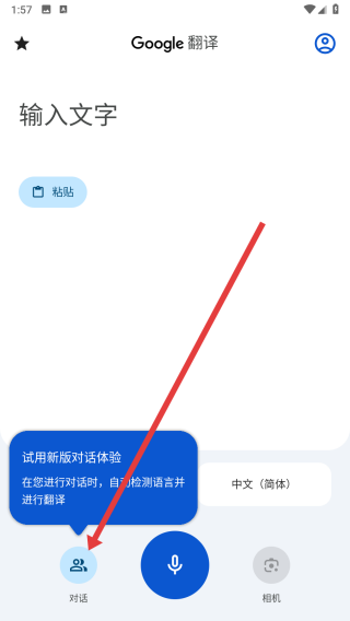2、在谷歌翻譯首頁中,可以點(diǎn)擊對(duì)話按鈕,使用語音翻譯功能。