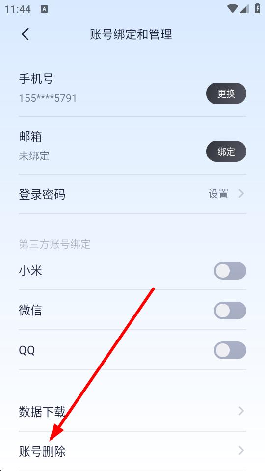 4、進(jìn)入賬號(hào)綁定和管理頁面后,下滑找到賬號(hào)刪除選項(xiàng),點(diǎn)擊進(jìn)入即可注銷。