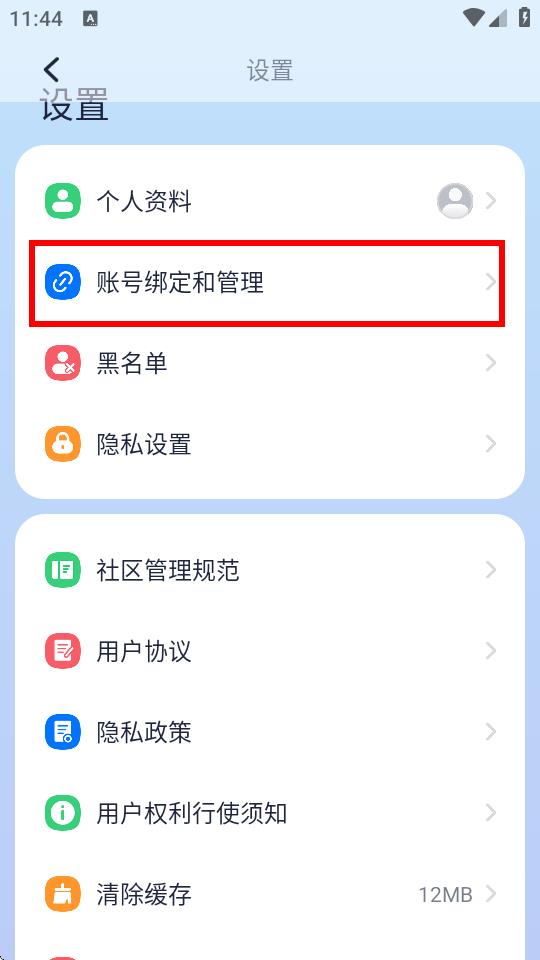3、在設(shè)置界面中,找到并點(diǎn)擊賬號(hào)綁定和管理選項(xiàng)。