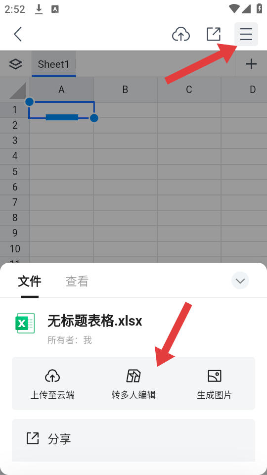 3、表格創(chuàng)建后,點(diǎn)擊右上角三條橫線的菜單按鈕,在彈出的功能欄中選擇轉(zhuǎn)多人編輯,就能將表格設(shè)置為在線協(xié)作模式。