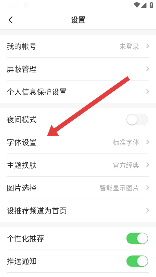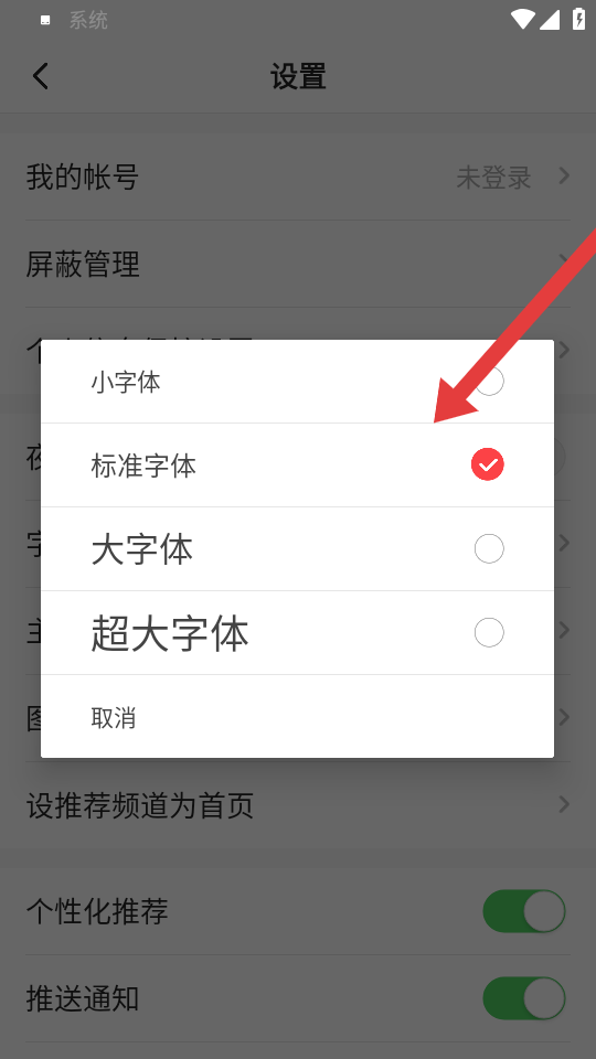 3、在設(shè)置的界面,需要點(diǎn)擊字體設(shè)置,彈出字體大小的選擇框。