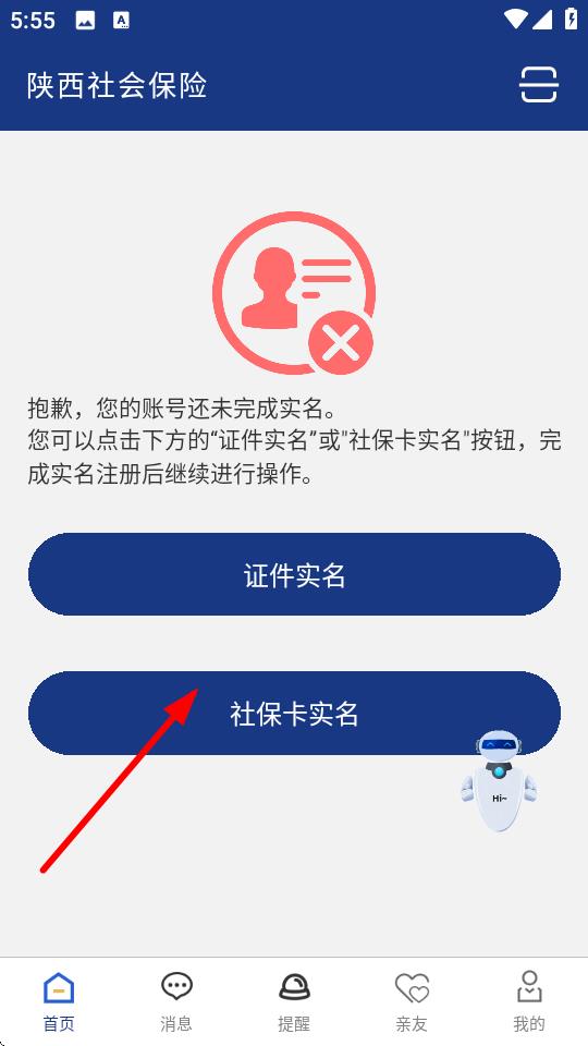 3、完成注冊跳轉(zhuǎn)登錄,成功登錄后,若遇未實名提示,在陜西社會保險實名頁面點擊社保卡實名按鈕,按流程提交社??ㄐ畔⒔壎?,完成實名認證環(huán)節(jié)。