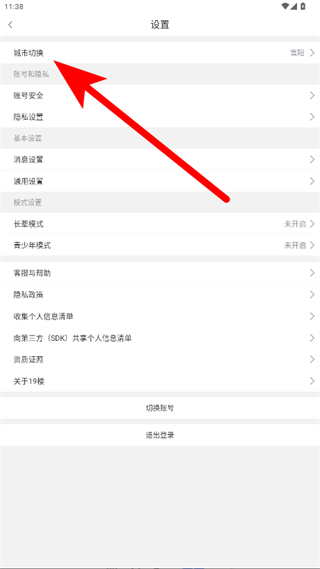 3、在設(shè)置頁(yè)面點(diǎn)擊城市切換,進(jìn)入城市切換頁(yè)面。