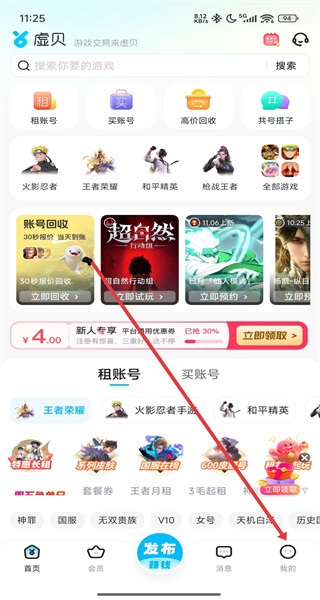 1、在進(jìn)入到虛貝租號(hào)首頁(yè)中,可以點(diǎn)擊下方我的按鈕,進(jìn)入我的主頁(yè)開(kāi)始登錄操作。