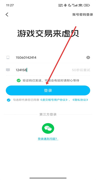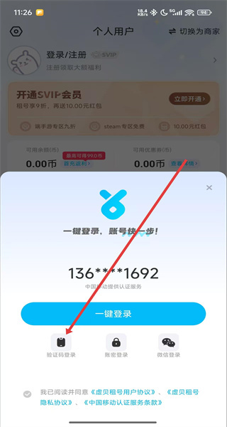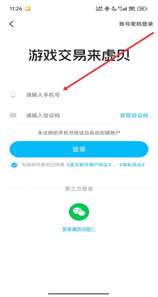3、在虛貝租號(hào)登錄頁(yè)面,輸入手機(jī)號(hào)碼后,點(diǎn)擊請(qǐng)輸入密碼的輸入框,準(zhǔn)備填寫(xiě)密碼完成登錄流程。