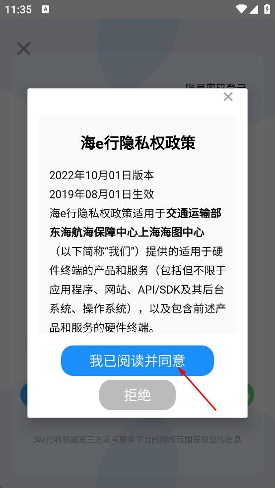 1、打開海e行APP,在彈出的“海e行隱私權(quán)政策”窗口中,點(diǎn)擊“我已閱讀并同意”按鈕。