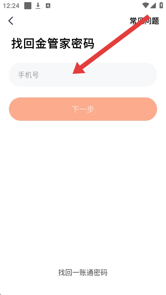 3、在找回金管家密碼頁面,于手機號輸入框填寫注冊賬號的手機號,點擊下一步,后續(xù)按系統(tǒng)指引完成新密碼設(shè)置。